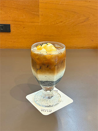 練黒ゴマミルクのカフェオレにみたらし団子の少し甘辛いタレがよく合います。